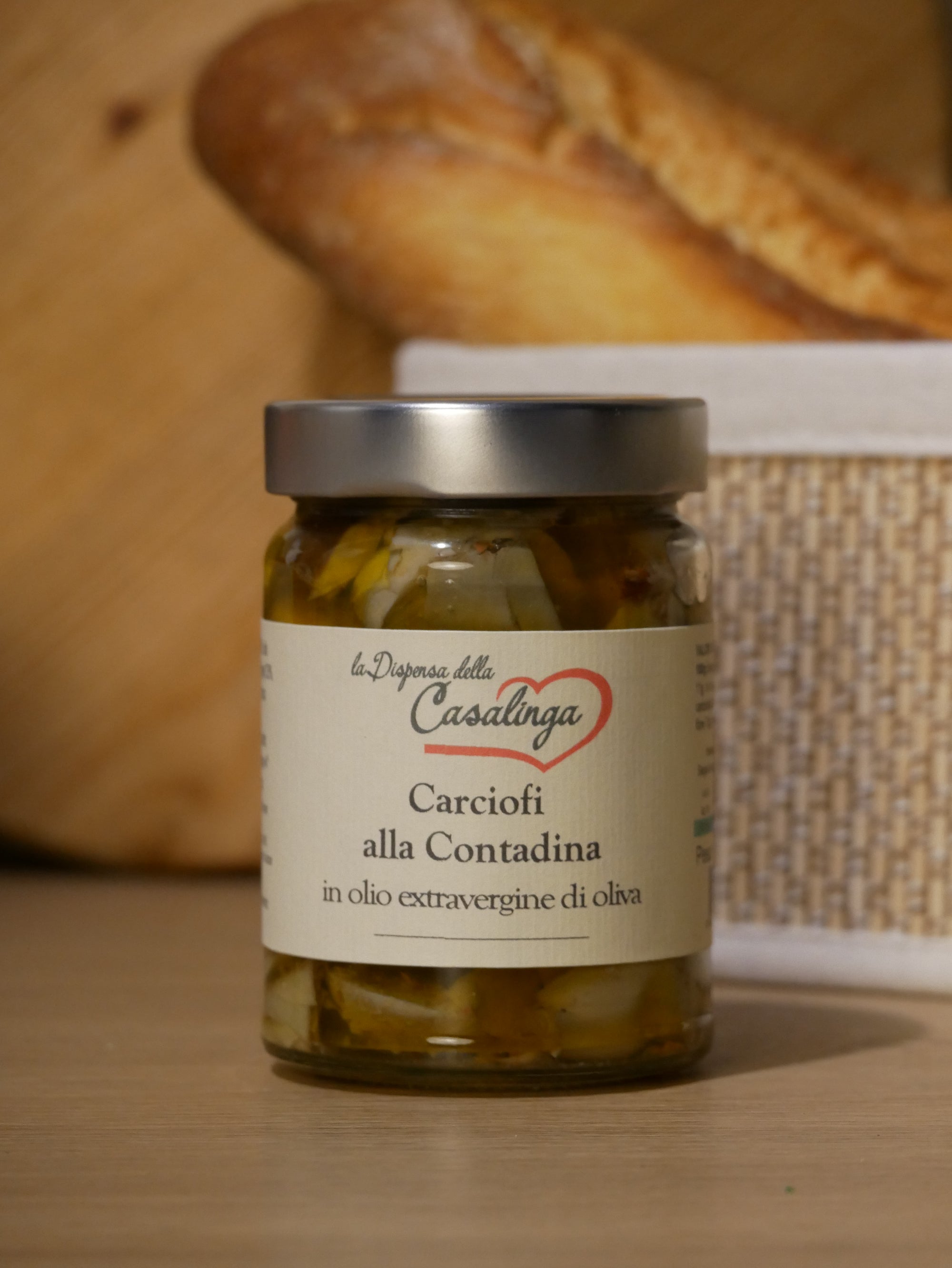 Carciofi 65%, olio extravergine di oliva (all’origine) 33%, aceto di vino, sale, peperoncino piccante, origano, aglio.