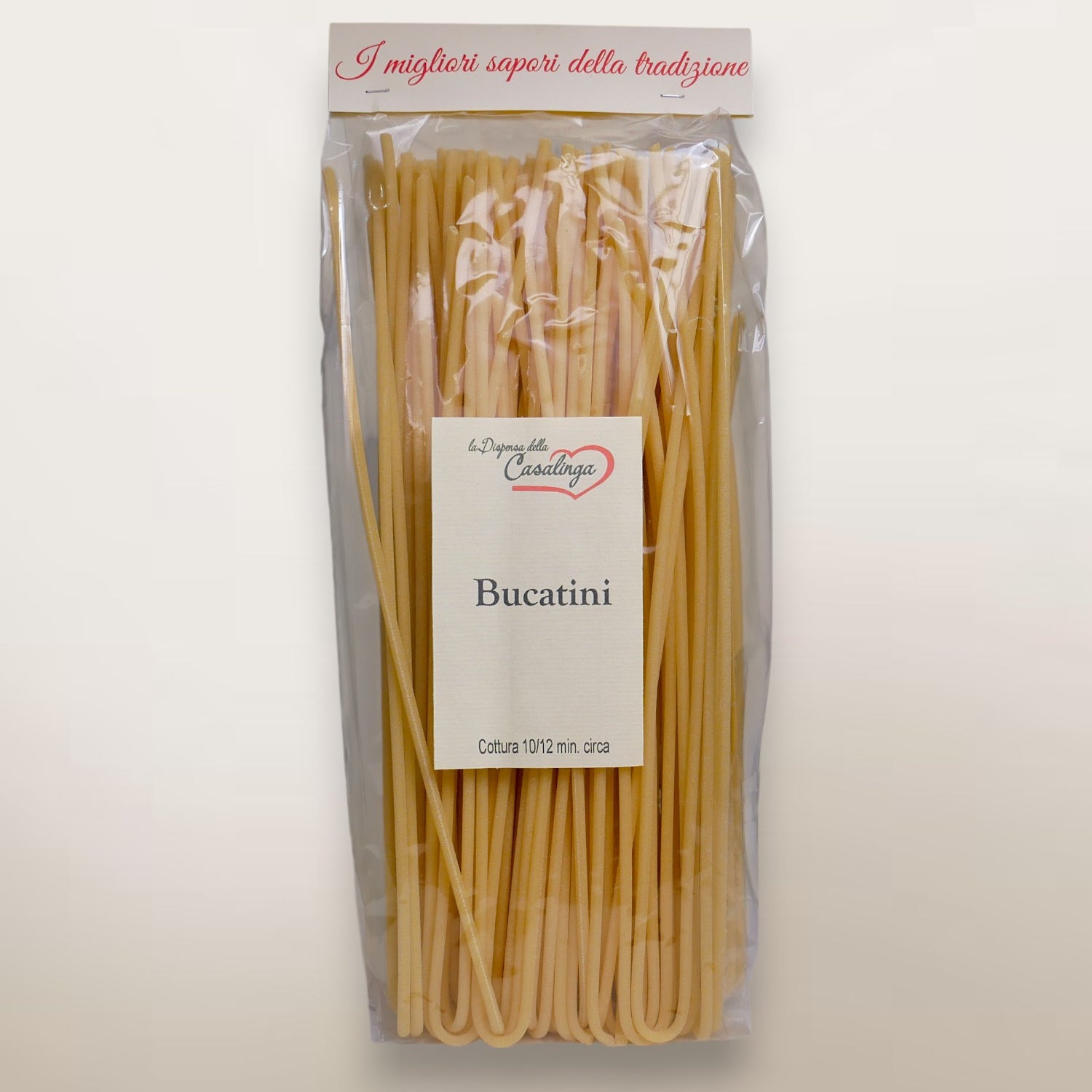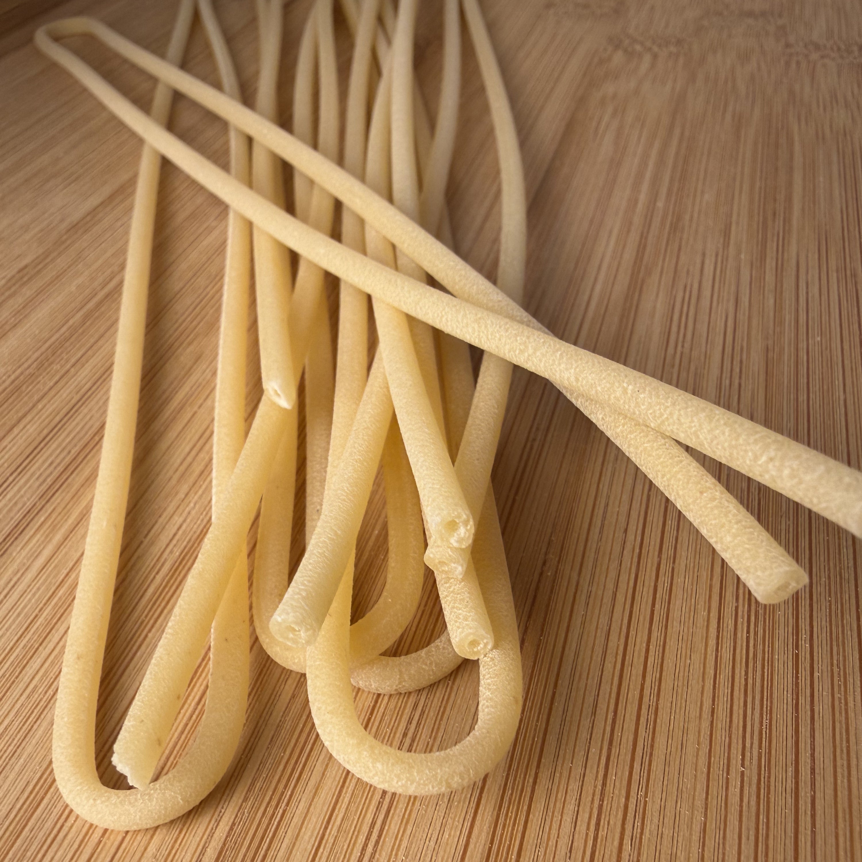 Bronze-drawing and slow drying give the pasta greater roughness, porosity and versatility. In Italian tradition, bucatino goes perfectly with our amatriciana sauce but is also suitable for any other condiment.
