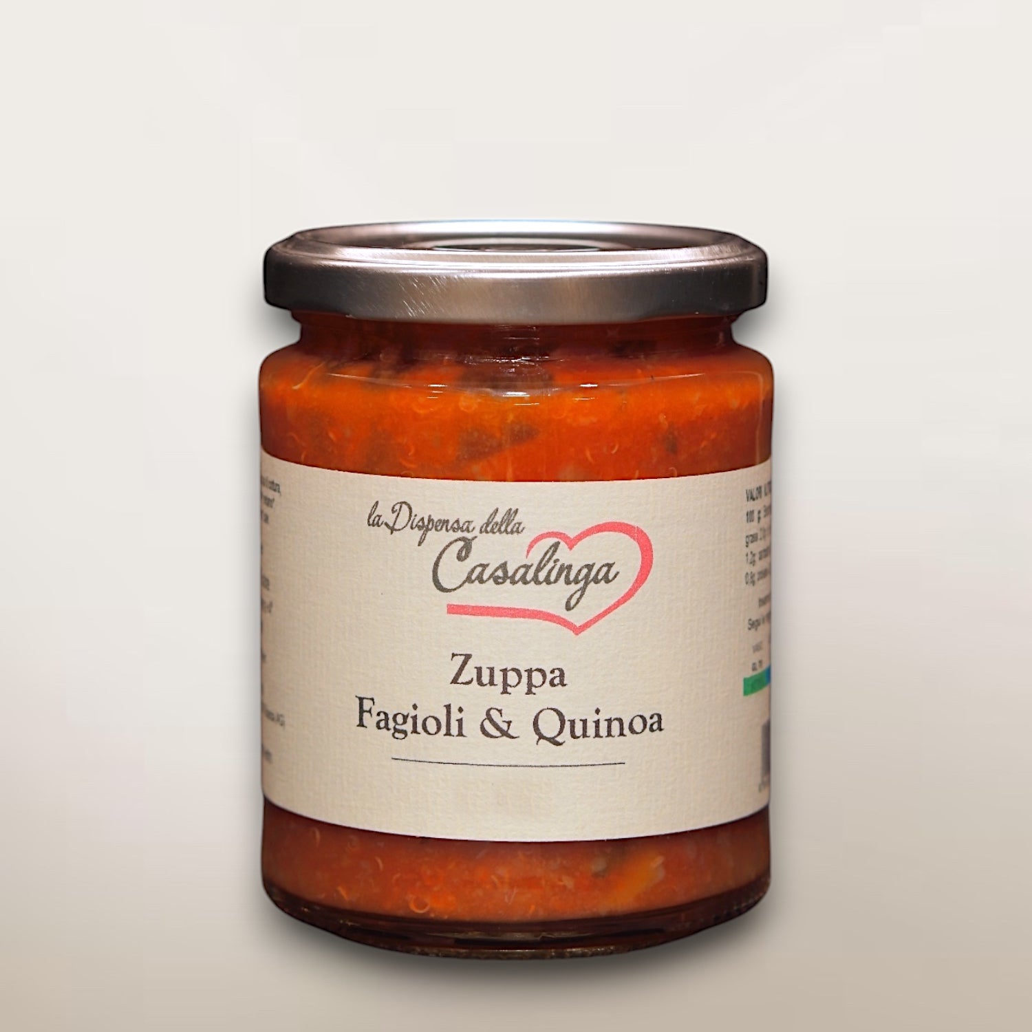 Beans* 47%, cooking water, tomato*, quinoa* 3%, onions, celery*, carrots*, extra virgin olive oil*, salt.