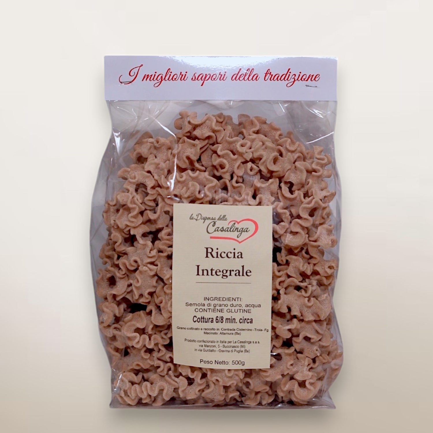 Our delicious wholemeal ricci, handcrafted with durum wheat semolina and water, can be used in various recipes: from traditional preparations to the most unusual and creative ones. The particular consistency of the pasta, rich in fibre, manages to retain the sauce well, giving emotions of pure pleasure to the palate.