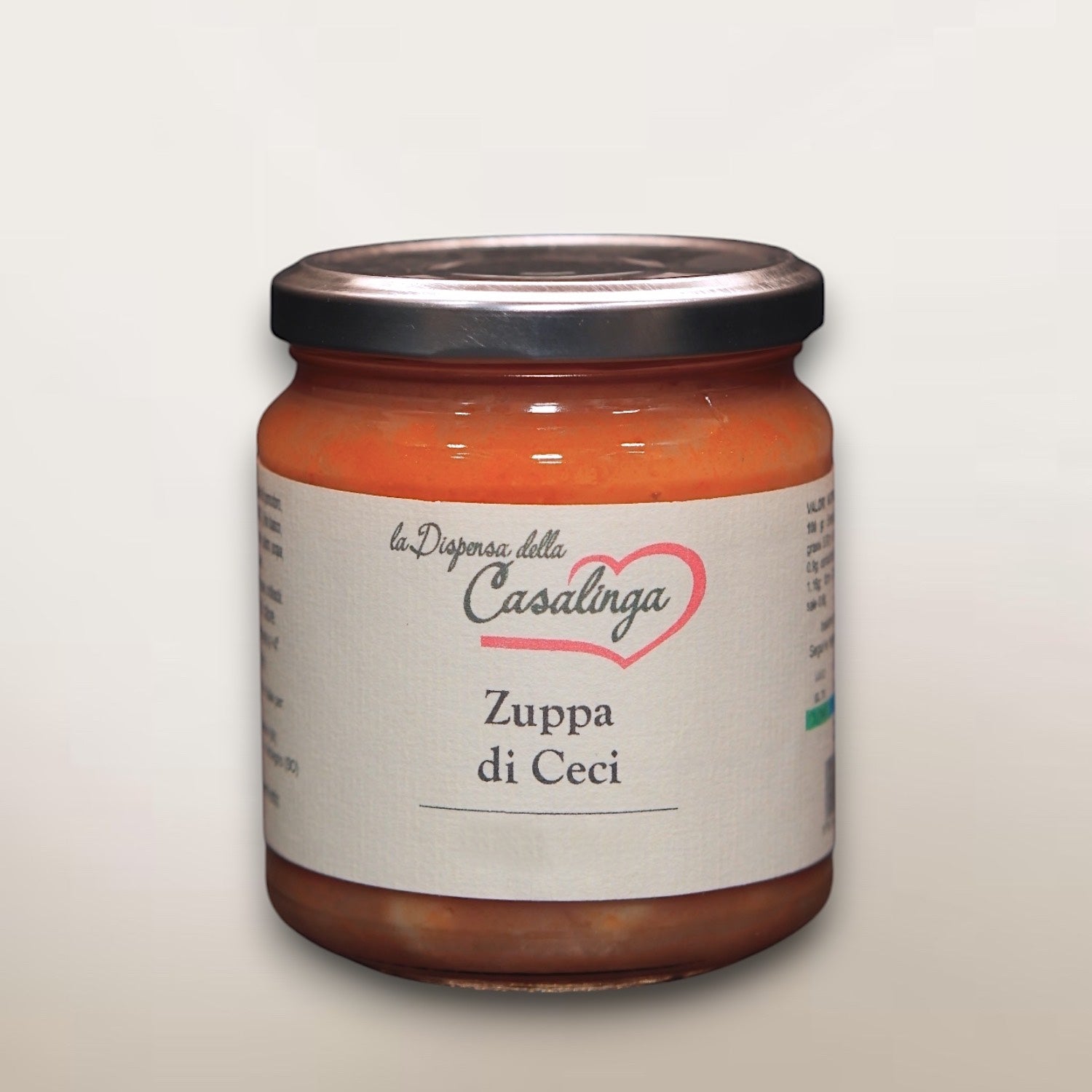 Water, chickpeas 36%, tomato puree, vegetables (onions, carrots, celery), extra virgin olive oil 5%, white wine, rice starch, salt, sugar, rosemary, bay leaf.
