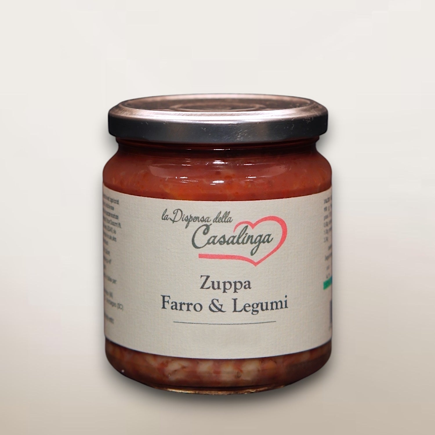 Water, legumes 35% (green lentils, borlotti beans, black-eyed peas, black beans, red kidney beans, hulled red lentils, hulled split peas, hulled split broad beans) in variable proportions, tomato puree, vegetables (onions, carrots, celery ), extra virgin olive oil 5%. Red wine, rice starch, salt, bay leaf.